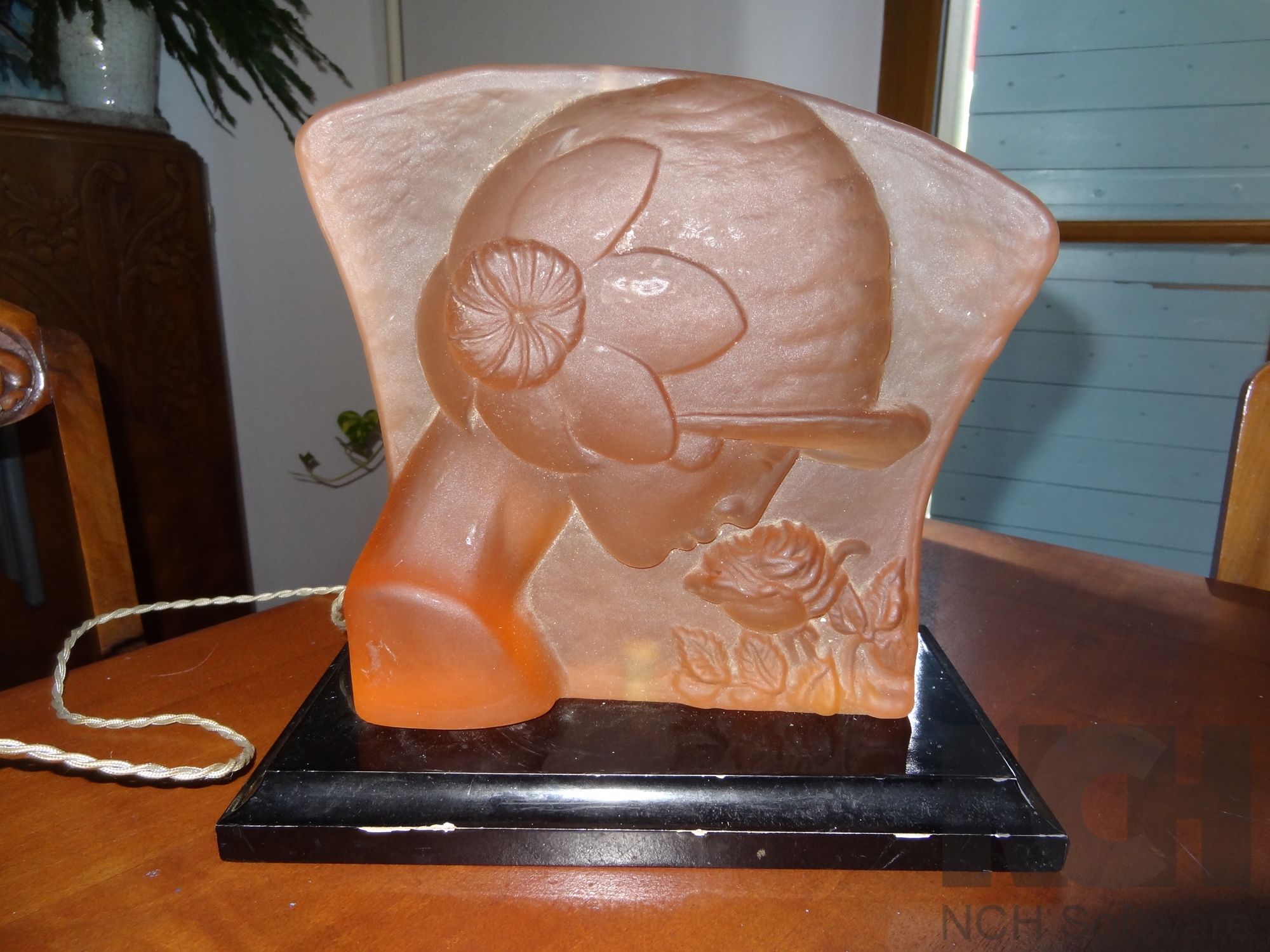 Lampe art déco représentant une femme respirant le parfum d une rose