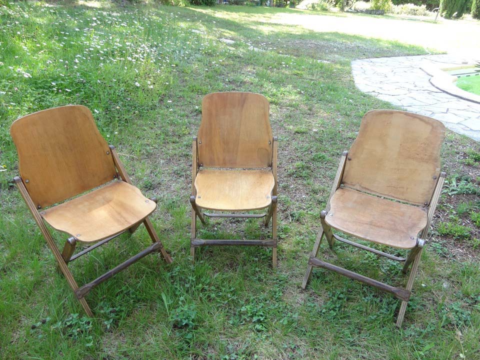 Structure en bois et contreplaqué, renforts et charnières en métal. Chaises pliantes, fonctionnelles, avec une belle patine d’usage.